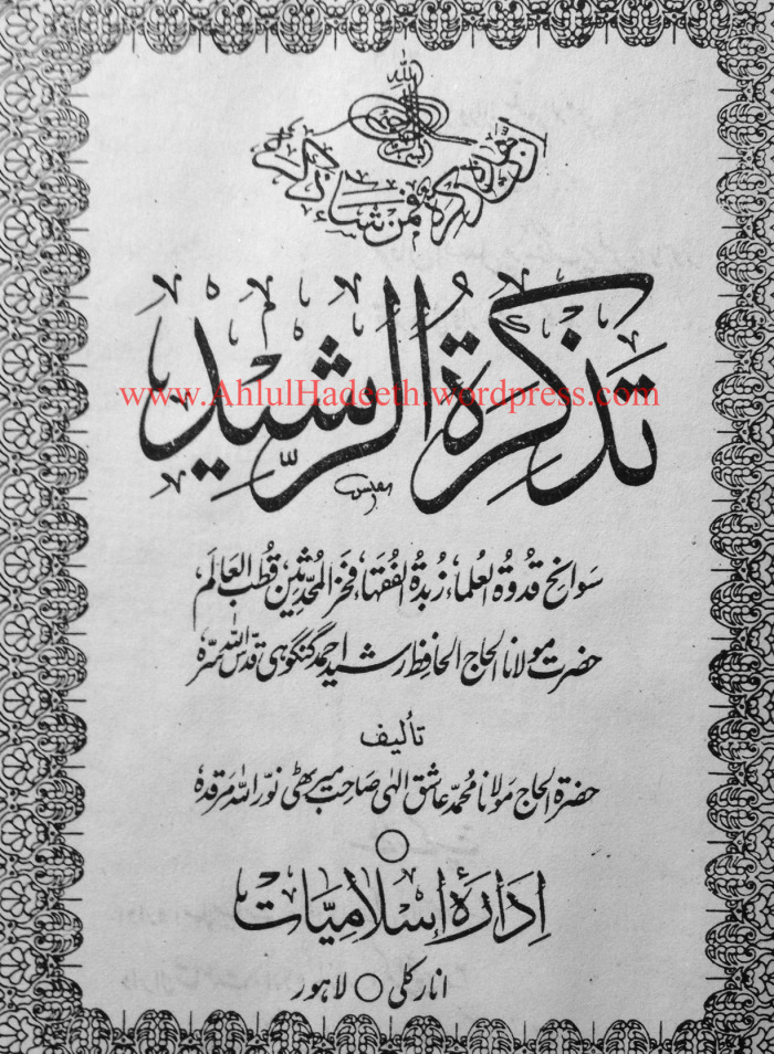 Rashid Ahmad Gangohi, a deobandi hanafi sufi churchfather who is considered one of the pillars of the deobandi sect had a biography written about him. It was per his sons instruction Masood Ahmad and the chief contributors and annotators were also deobandi sufi churchfathers in their own right from them were the likes of Ashiq Ilahi Meerthi, Abdul Qadir Raipuri and Khalil Ahmad Saharanpuri (or Ambethvi – the author of Muhannad). It was essentially penned by Ashiq Ilahi and Khalil Ahmad Saharanpuri annotated it. Then Khalil Ahmad Saharanpuri took it upon himself to publish this biography.