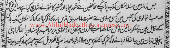“during the era his opposers (ie Rashid Ahmad Gangohis) were causing commotion concerning the issue of Imkaan al-Kadhib (the possibility of Allaah lying) and issued a legal edict of his takfir. In a gathering of Sian (a reverend saint) Tawakul Shah Anbalwi a moulvi mentioned the divine and holy Imams name and said he believed that Allaah could lie. On hearing this Sian Tawakul Shah lowered his head an began to meditate (in a trance) for a while and then lifted his head and said  in punjabi, “What are you people saying!!! I am seeing the pen of Maulana Rashid Ahmad (Gangohi) writing above and beyond the (Allaahs) Arsh .” (Tazkirah ut-Rashid (2/322) (this was the outcome of his meditation)